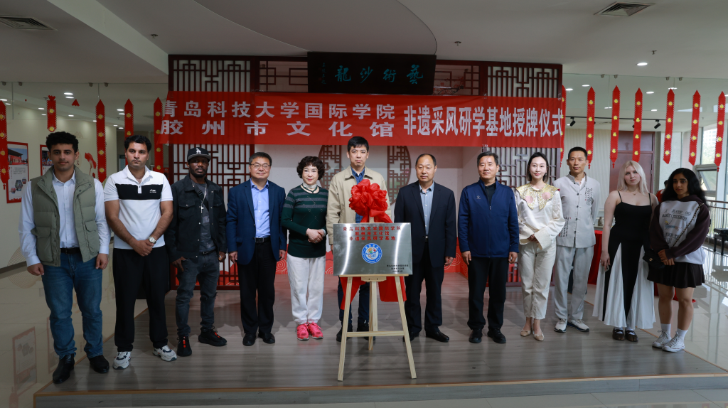 上午10时,授牌仪式在胶州市文化馆正式举行。双方共同为“非遗采风研学基地”揭牌,标志着校地在非遗传承、国际文化交流、实践育人等方面建立长期稳定合作机制。马骥表示,基地将作为学院留学生国情教育、文化实践与语言实践的重要平台,常态化开展非遗研习、文化调研、技艺体验等课程化活动,助力留学生全面感知中国传统文化底蕴。