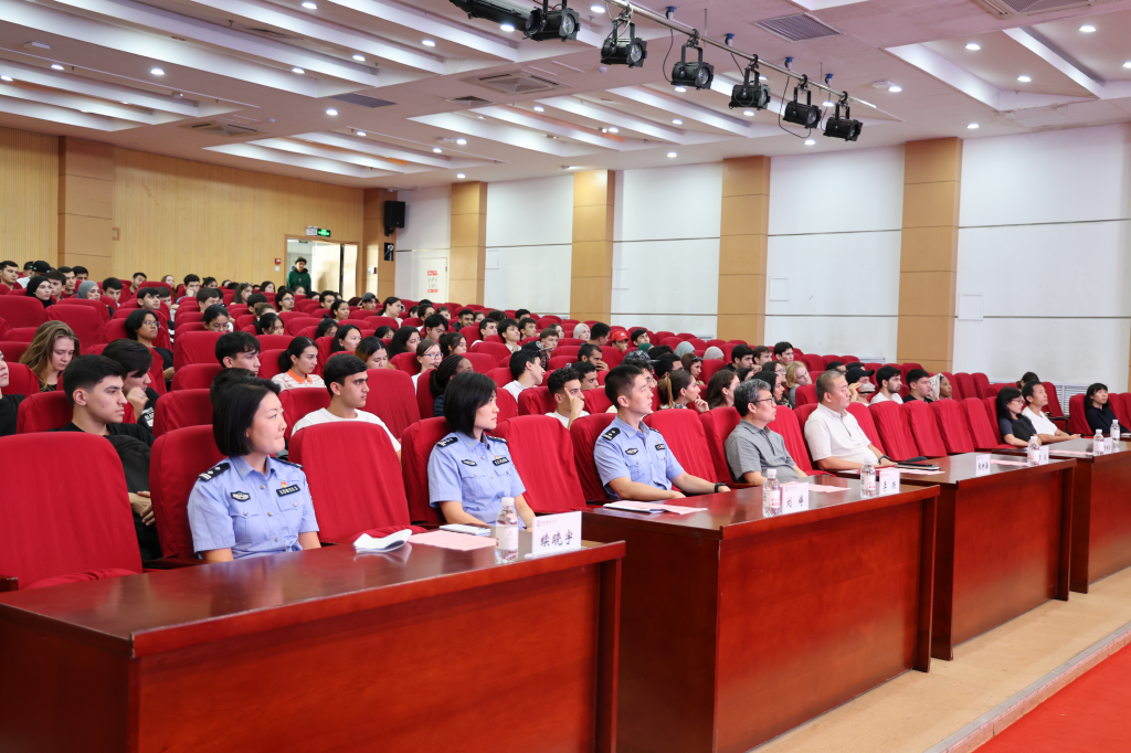 青岛市出入境管理局管理科李扬警官做了中国法律法规宣讲,详细解读了《中华人民共和国外国人出入境管理条例》。他强调,留学生在中国境内求学期间须遵守中国法律法规,不得危害中国国家安全、破坏社会公共秩序,严禁触犯法律,帮助来华留学生树立法治思维。签证科刘婷警官强调了签证申请流程、签证申请必备材料清单,重点讲解了学习类居留许可的使用规范,提醒留学生避免因认知偏差触碰法律红线。交通安全课上,崂山出入境续晓宇警官结合青岛路况特点敲响警钟,提醒学生“骑行务必戴头盔,夜间打车要记下车牌号”等出行注意事项,同时聚焦人身财产安全,通过“冒充使馆诈骗”“宿舍失窃”“海边游泳安全”等案例,传授实用技巧。