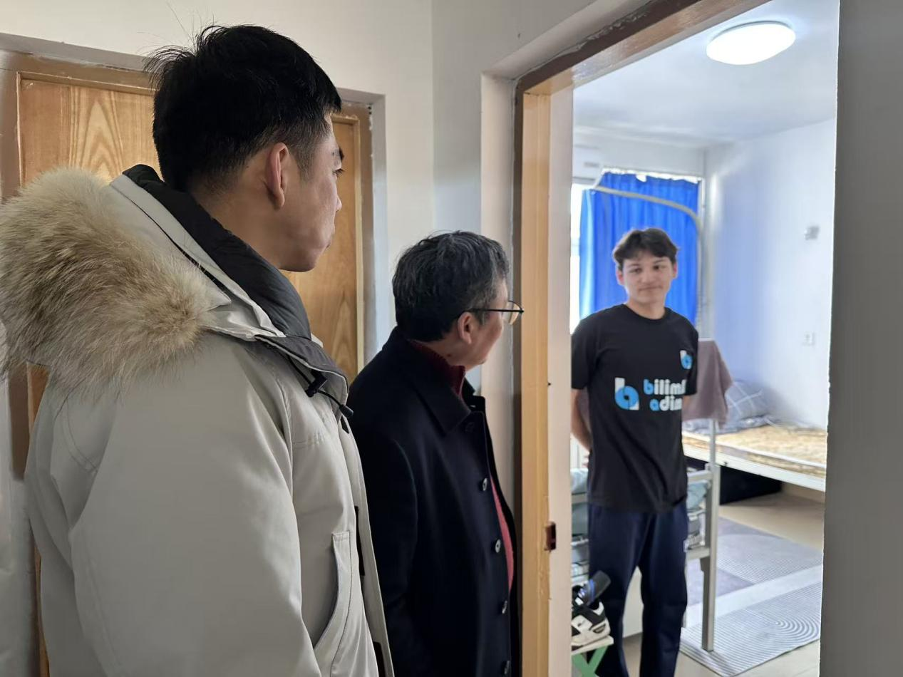 马骥一行逐间排查宿舍违规用电、消防设施等安全隐患,现场督促整改问题,重点叮嘱同学们离校前彻底清扫宿舍卫生,寒假离校在外期间时刻注意自身安全,做好各项防护。张树海为同学们送上中国假期节日祝福,同时鼓励大家寒假期间坚持练习汉语,多感受中国传统节日文化与民俗风情。此次走访检查,既筑牢了国际学生宿舍假期安全防线,也让异国学子感受到学校的暖心关怀,助力其更好体验中国节日与文化。